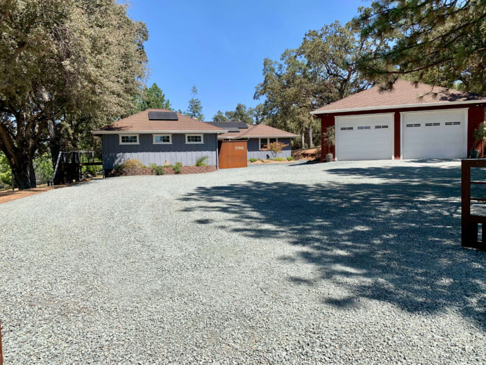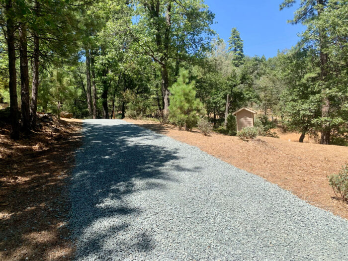 With hilly terrain in Nevada County, the optimal driveway rock is mined locally and identified as “3/4-inch crushed mine rock with fines”; also known as “road base.” When applied correctly over a carefully prepared surface and compacted, it can stay in place for several years.